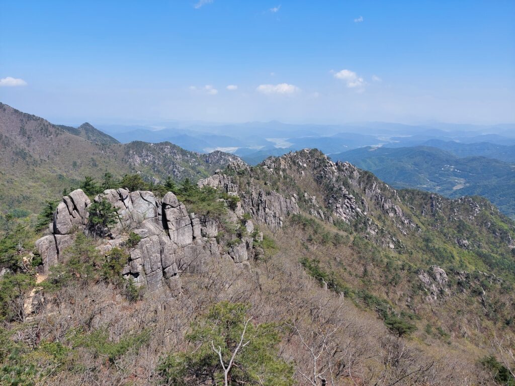 And then the dirt trail was replaced by stairs. By itself, that wasn’t very interesting, although my knees were certainly not looking forward to it. But after clearing a few of those stairs and looking around I noticed a sign that stopped me in my tracks. I wasn’t sure what it actually said, as the sign was in Korean, but the image they put there was worrying enough so that I used google translate, and the broken English on display told me there might be black bears in the area. I had no idea how real that danger might be, or how well the sign got translated, but it was enough for me to feel quite scared. From that point my progress up Sangwangbong Peak had slowed down. I’d stop every few steps to check if I can hear or see anything suspicious. Trying to be stealthy, I felt very aware of how much noise I make moving around. At that moment I really wished there were other people around. The road became steeper, but that didn’t really bother me, even if it did make the climb more difficult.