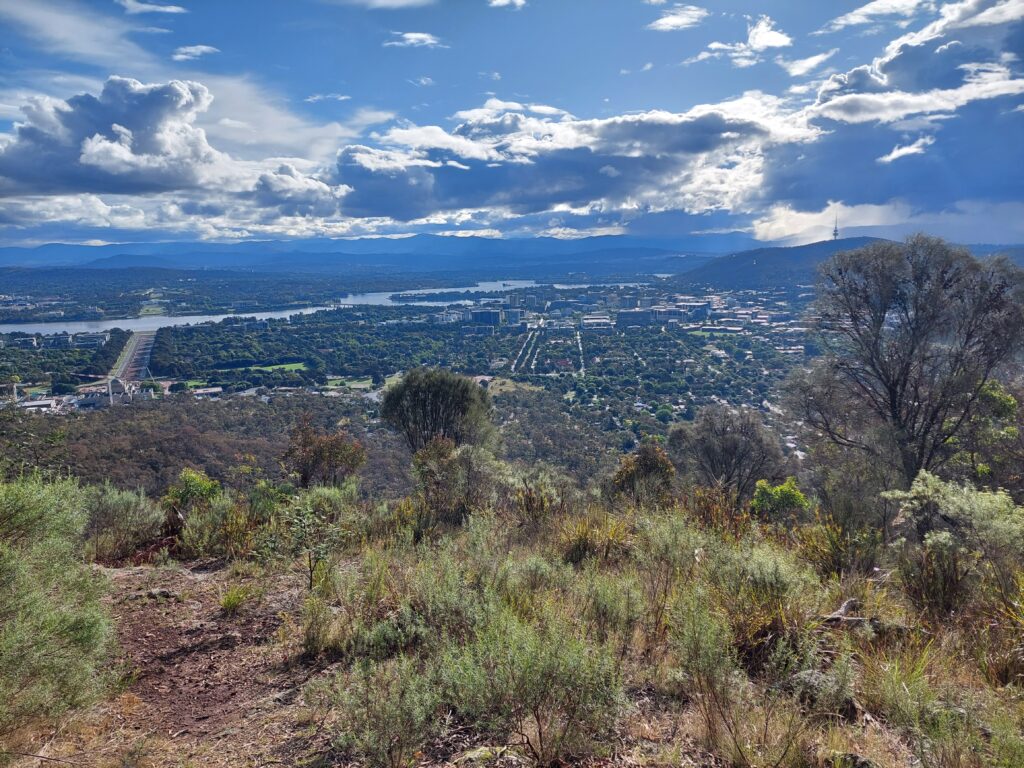 After getting a bit confused on how to leave the building (and being directed by multiple staff members), I wanted to make my way up the nearby Mount Ainslie to the lookout at the top of it. But as the rain started again, I sat down on a sheltered bench and waited for it to stop. Once again, it took several minutes, and even though the sky was still cloudy, I started the walk anyway. The road itself didn’t feel very special. It was a clear and comfortable path for the most part, going between the trees up the mountain. There were quite a few twists and turns along the way, and in several points there were signs which I didn’t read, but that was about it. A short while before I got to the lookout there was a gap in the trees with a nice view of the city. After a brief look I kept going up, and soon enough I was at the lookout on top of Mount Ainslie. Unobstructed by trees, there was a clear view pretty much all the way around the lookout, and it was nice to see the city from above. But since there wasn’t much to do there beyond that, I quickly made my way back down.